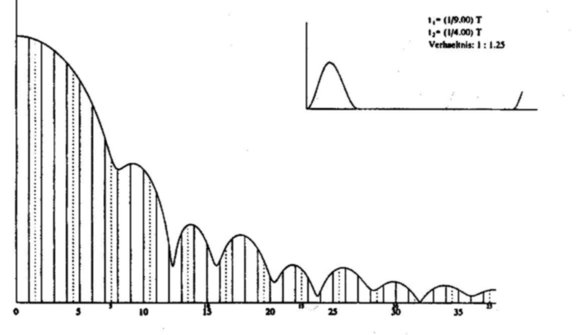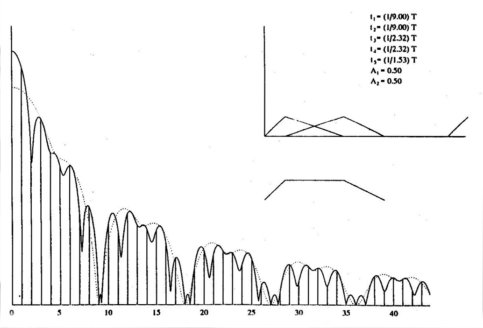 Abbildung 11: Das Spektrum des aus der Kombination zweier Dreieckimpulse hervorgegangenen Trapezimpulses. Die punktierte Enveloppe gilt für das Dreieck, das entsteht, wenn die beiden Trapezflanken zusammengeschoben werden. Der Amplitudenmaßstab ist hier, wie bei allen folgenden Abbildungen, logarithmisch zur Darstellung des Schallpegel in dB-Maß.