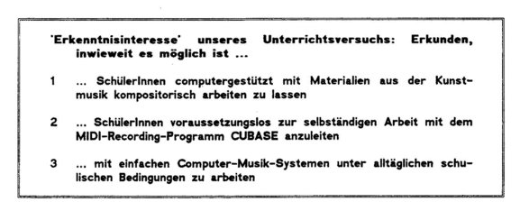 Diese leitende Fragestellung implizierte natürlich auch die Frage, ob es möglich ist, die Schüler innerhalb ganz kurzer Zeit voraussetzungslos zur selbständigen kompositorischen Arbeit mit dem MIDI-Recording-Programm Cubase zu befähigen. Im Grunde genommen läßt sich diese Frage nach der Brauchbarkeit als dritter Aspekt unseres Erkenntnisinteresses auch ganz allgemein formulieren: Ist es möglich, mit bezahlbaren Computer-Musik-Systemen im Musikunterricht unter alltäglichen, realen Bedingungen hinsichtlich Zeit, Raum, Gruppengröße, Kompetenz und Ergebnis an anspruchsvollen musikpraktischen Aufgaben zu arbeiten? |