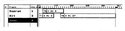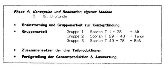 Die Fuge hat vier Stimmen, da wir aber nur drei Arbeitsplätze zur Verfügung hatten, haben wir die Sopranstimme auf die drei AGs aufgeteilt und dann jeder AG eine weitere Stimme zugewiesen. Man kommt so zu einer horizontalen Aufteilung des Materials, d.h. jede AG bearbeitete eine Stimme über die volle Länge der Fuge und zusätzlich einen Ausschnitt aus der Sopranstimme.
