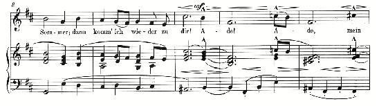 Es entstehen also eher fauxbourdon-artige Klänge, die jedoch innerhalb der Harmonik der Jahrhundertwende ebenso fremdartig wirken. Zu »Ade« erklingt dann eine »echte« Quintparallele: e-Moll-Quintlage gefolgt von h-Moll-Quintlage über dem Orgelpunkt h.