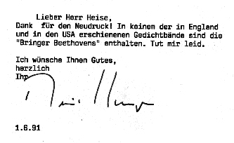 In einem kurzen Gespräch mit dem englischen Lyriker Michael Hamburger, 1991, erinnerte sich dieser an das Gedicht. Den Nachweis übermittelte er in einem späteren Brief: