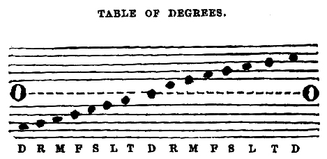 Indem man eine Linie zwischen zwei Systeme einfügt, erhält man für die Noten der Doh-Skala in der O-Spalte eine regelmäßige Stufenfolge, genauer degrees genannt.