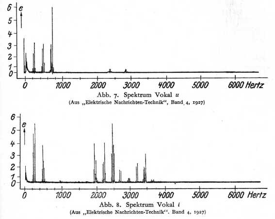 hier die Formantbereiche in andern Frequenzbezirken liegen. Als Beispiele seien noch die Vokalbilder von u und i herangezogen (Abb. 7 und 8), die in der gleichen Weise wie der Geigenklang Abb. 4 gewonnen sind.