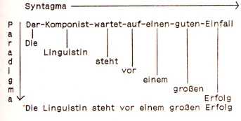 Ausdruck Saussure nennt ihn signifiant. (z.B. auf Wortebene die Bezeichnung Buch) auf der einen, und einen konkreten Inhalt Saussure nennt ihn signifié. auf der anderen Seite (im genannten Beispiel das bezeichnete Buch, das in seinen außersprachlichen Merkmalen in der Vorstellung des Sprechers/Hörers existiert). Die Zuordnung der beiden Aspekte ist dabei konventionsbedingt und einzelsprachspezifisch, also willkürlich. Auch untereinander weisen die Zeichen bestimmte Beziehungen auf, wodurch sie erst ihren konkreten Wert innerhalb des Systems erhalten. Die Gesamtheit dieser Beziehungen bildet die sogenannte Struktur des Sprachsystems. Zwei Typen von Relationen sind von Bedeutung: der erste bezeichnet die Ordnungsbeziehung, die zwischen mehreren aufeinander folgenden sprachlichen Einheiten besteht. Diese lineare Verknüpfungsrelation wird syntagmatische Beziehung genannt. Der zweite Typ, die paradigmatische Beziehung, ist eine Ersetzungsrelation und definiert die Austauschbarkeit von Zeichen, die derselben (Wort-)Kategorie angehören. Das folgende Schema verdeutlicht die beiden Relationen: ![]() Abb. 3: Relationen auf Satzebene Aspekte dieser zwei Typen von Relationen werden Gegenstand in Kapitel 2.2.3 sein. Es bleibt noch nachzutragen, daß sich die Bestimmung von sprachlichen Strukturprinzipien in der Linguistik nicht nur auf solche in den Einzelsprachen beschränkt - man spricht dann von der Grammatik dieser Sprache -, sondern daß auch die für alle Sprachen gleichermaßen geltenden Gesetzmäßigkeiten festgelegt |
