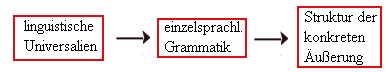 ![]() Abb. 4: Die drei Arten sprachlicher Strukturbildung (nach Bierwisch 1978, S. 34) 2.2.3 Das Sprachsystem Die universelle und einzelsprachliche Systematik von Sprache, ihr Zeichencharakter und ihr strukturierter Aufbau spiegeln sich in den verschiedenen sprachwissenschaftlichen Teildisziplinen wider: Phonologie, Morphologie, Syntax, Semantik und Pragmatik. Die ersten beiden Beschrei-bungsebenen sollen hier nur am Rande behandelt werden, da sie nach meiner Ansicht für den späteren Vergleich mit musikalischen Strukturen nur bedingt Aussagewert haben. Die letzten drei Disziplinen hingegen sind bereits vielfach ausführlicher in bezug auf Musik diskutiert worden. Ihre grundlegenden Gesichtspunkte sollen daher vorgestellt werden. 2.2.3.1 Der semantische Aspekt In Kapitel 2.2.2 habe ich bereits gezeigt, wie sich in der Sprache in einer Hinsicht Bedeutung konstituiert: durch die Beziehung sprachlicher Ausdrücke zur außersprachlichen Wirklichkeit. Der Gegenstand oder Sachverhalt, für den ein Ausdruck steht, heißt Denotat oder Referent. Was im Hinblick auf die mentale Verarbeitung von Sprache (s. Kap. 3) erwähnenswert ist, ist die Tatsache, daß die Verbindung zwischen Sprachzeichen und Referent nur über ein psychologisches Konzept/einen Begriff hergestellt werden kann, der im Gedächtnis des Sprachbenutzers abgespeichert ist. So könnte beispielsweise der Ausdruck Musikerin über den in viele semantische Merkmale aufgespaltenen Begriff |