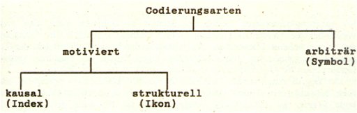 ![]() Abb. 11: Die Codierungsarten (erweitert nach: Bierwisch 1978, S. 44) Ein Ikon liegt vor, wenn zwischen Lautform und Bedeutung eine Ähnlichkeit besteht, also eine strukturelle Beziehung vorliegt. In der Sprache kennt man diesen Typ Zeichen von den lautmalenden Wortschöpfungen (Onomatopöie) wie "Kuckuck" oder "Bums". Auch in der Musik werden strukturell vermittelte Codierungsarten verwendet, die man in zwei Gruppen aufspalten kann: a) Imitation Die lautliche Form des Bezeichneten wird unmittelbar in die Musik übertragen. [Z.B. akustische Erscheinungen wie Tier-, insbesondere Vogelstimmen, Gewitter, Jagdrufe, etc.] b) Deskription Bei dieser Art der Tonmalerei wird optisch wahrnehmbare Bewegung, also etwa Vorgänge in der Natur oder szenische Handlungsabläufe in Tonbewegungen übertragen sowie Charakterzüge von Personen in Musik übersetzt. [So wird beispielsweise in den "Pièces de Clavecin" (1713) von F. Couperin die flatterhafte Bewegung von Schmetterlingen nachgezeichnet ("Les Papillions"), und in "Die Eilige" ("La Diligente") erscheinen unruhige Sechzehntelketten als Abbild hastiger Bewegung.] Besteht zwischen Klanggestalt und Bedeutung dagegen ein kausaler Zusammenhang, so spricht man von indexikalischen Zeichen. Die kausale Verknüpfung kommt dabei durch das Eingebettetsein der Lautform in ei-nen bestimmten Verwendungszusammenhang zustande, der ihr so eine konkrete Bedeutung verleiht. Später kann die Klanggestalt die jeweilige Bedeutung dann auch assoziativ - ohne den ursprünglichen Kontext - vermitteln: beschleunigter Puls als Index für Fieber, eine werbefunktionale Wortneuschöpfung als |