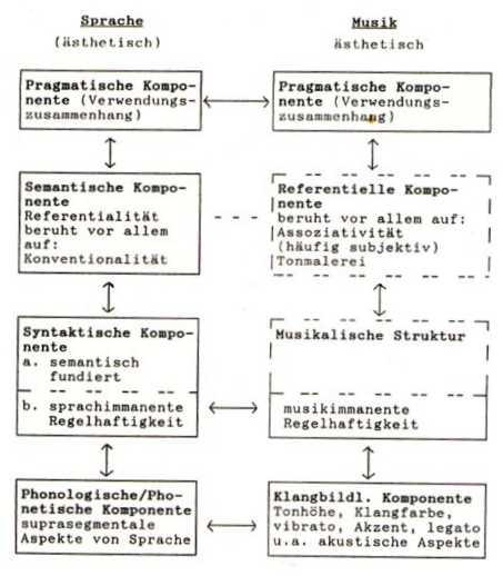 ![]() Abb. 13: Parallelen und Unterschiede in der sprachlichen und musikalischen Bedeutungskonstitution Die klanglichen Parallelen, d.h. vor allem die Überschneidung der akustischen Parameter bei Sprache und Musik sind in Kapitel 2.2.1 zur Sprache gekommen. Sie äußern sich in jeweils verschieden starker Ausprägung auch in Form intersubjektiv gültiger Intonationsmuster und Ausdrucksgesten. Es ist ebenfalls gezeigt worden, daß sowohl Sprache als auch Musik als abstrakte Systeme beschrieben werden können, die eine syntaktische und eine pragmatische Komponente besitzen. Dazu kommt jeweils eine Komponente, die für die Bedeutungskonstitution die Referentialität der Zeichen sicherstellt, wobei die Beziehung |