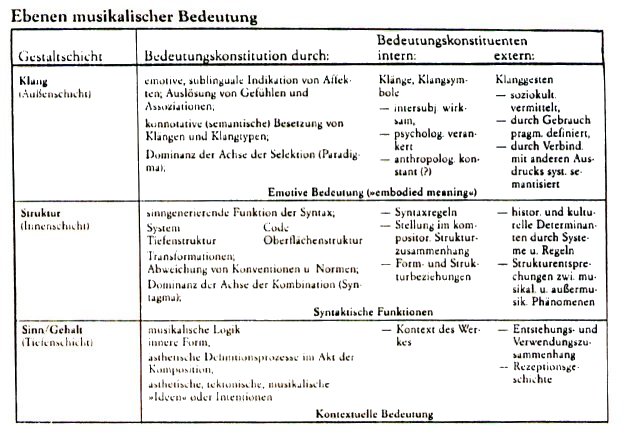![]() Abb. 14: Ebenen musikalischer Bedeutung (aus: Gruhn 1989, S. 83; Ausschnitt) Innerhalb dieses Argumentationszusammenhangs ist es ein logischer Schritt, von musikalischem Verstehen als einer "[...] Umkehrung des Prozesses der Bedeutungskonstitution" (ebd., S. 195) zu sprechen. Der Musikhörende sollte also, ähnlich dem Sprachrezipienten, die genannten Variablen der Bedeutungskonstitution nachvollziehen können, damit man von ihm sagen kann, er habe eine Komposition in ihrem emotiven Ausdruck, ihrer syntaktischen Funktion und/oder in ihrem Gehalt verstanden. Der Verstehensprozeß ist jedoch - auf diese objektiven Bedeutungsanteile begrenzt - noch unvollständig. Der Verstehende selbst gestaltet nämlich den Verstehensprozeß auf aktive und sehr individuelle Weise mit. Diese subjektiven Bedeutungsanteile, die teilweise schon auf der ersten Bedeutungsebene des Gruhnschen Schemas angedeutet werden, kommen nun ausführlich im dritten Kapitel zur Sprache. |