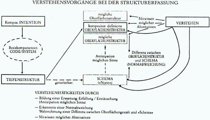 ![]() Abb. 23: Verstehensvorgänge bei der Strukturerfassung (aus: Gruhn 1989, S. 129) Die Spannung zwischen Norm und Abweichung ist es, die es zu entdecken gilt, eine Tatsache, die sich auch im sprachlichen Bereich aufzeigen läßt. Sloboda (1985, S. 2/3) führt z.B. eine Analogie zwischen dem Verstehen eines Witzes und dem Musikverstehen an: Einen Witz erfassen heißt, Wörter, Sätze und die darin zum Ausdruck gebrachten Propositionen zu erkennen, eine mentale Repräsentation aufzubauen und schließlich mit Hilfe des sprachlichen und des Weltwissens die Art der Inkongruenz, Zweideutigkeit, etc. herauszufinden, die den Witz ausmacht. Ähnliches gilt für die Musik (s. Abbildung).