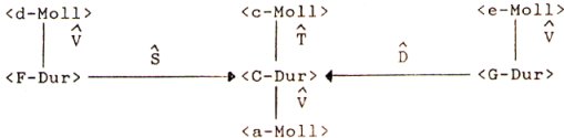 nicht vermag. Spannungserhöhend, -abbauend oder -erhaltend können sogenannte konjunktive und disjunktive Relationen (V = Vertreterrelationen) sein. Die ihnen entsprechenden Propositionen können verschiedene, aber gleichwertige Argumente besitzen. Man denke nur an die vielen unterschiedlichen Vertreterklänge der Dominante (D, d, Dp, D7, D7), die in D-Relation zur Tonika zu stehen vermögen, entweder (disjunktiv) einer von ihnen allein oder (konjunktiv) mehrere nacheinander. Bruhn postuliert, daß Propositionen nicht nur ideal sind, um die harmo-nischen Beziehungen formal zu beschreiben, sondern daß sie auch die mentalen Relationen zwischen Schemata kennzeichnen. Propositionale Beziehungen, so Bruhn, bestünden auch zwischen den Akkorden von möglicherweise mental existierenden Tonalitätsschemata (z.B. C-Dur, s. Abb. 24) ![]() Abb. 24: Propositionales Schema von C-Dur (Ausschnitt aus den theoretisch möglichen Beziehungen; aus: Bruhn 1988, S. 85)