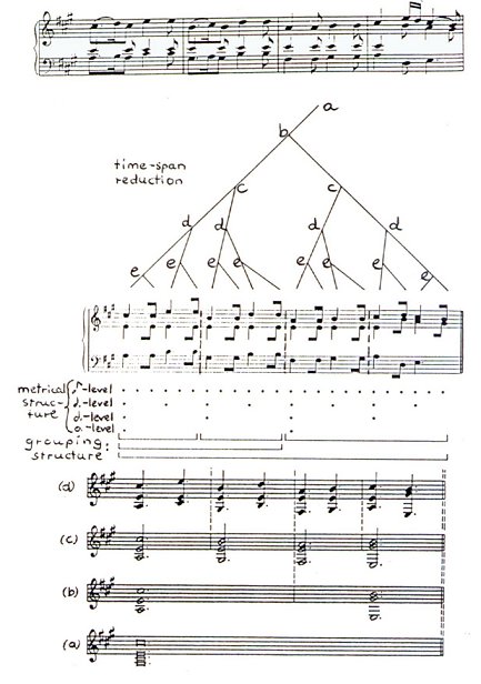 Die Inhalte der Regeln können hier nicht im Detail besprochen werden (ein Überblick über die Regeln befindet sich im Anhang A), soll aber zumindest mit Hilfe eines Beispiels verdeutlicht werden. Eine simplifizierte, um Wechselnoten und Nachschläge gekürzte Fassung des Anfangs von Mozarts Sonate KV 331 soll als Anschauungsobjekt für die vier verschiedenen Strukturanalysen dienen (s. Abb. 33 und 34). ![]() Abb. 33: Grouping und metrical structure sowie time-span reduction der Anfangstakte von Mozarts Sonate KV 331 (aus: Lerdahl/Jackendoff 1983, S. 118, West/Howell/Cross 1991, S. 37 und Clynes 1983, S.100)) |