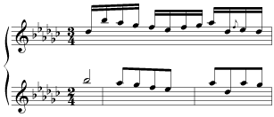 Noch eine weitere Variante ist für die beiden Rahmenteile der es-Moll-Romanze konstitutiv (Notenbeispiel 5, Takt 5 und 6, 28 und 29, 35) und bereitet sozusagen die Hauptversion in Takt 9 vor, bei der die Substanz des Doppelseufzers in Terzen offen zutagetritt, unterlegt mit Girlandenfiguren der linken.