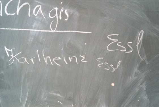 Karlheinz Essl erläutert zum Schluss seine Erfahrung in der Zusammenarbeit mit den Schüler/-innen, die er ebenfalls als sehr bereichernd empfunden hat. Essl: Es war für mich eine wichtige Erfahrung, weil ich noch nie mit Schülern gearbeitet habe und es war berührend zu sehen, wie ihr in der Lage seid, etwas zu machen, was eigentlich nur Profis können. Es hat mich total bestärkt. Ich war mir nicht sicher, wie ich gekommen bin, ob das ganze klappt. Ich habe gedacht, es könnte auch in die Hose gehen. ...Jetzt bin ich total glücklich, dass wirklich ein Stück daraus geworden ist. ...Das wird ein Teil werden in meinem Werkverzeichnis, wo ich sage, das habe ich für euch gemacht, mit euch gemacht und das ist ein Stück. Und es wird sicher woanders auch gespielt werden, mit anderen Leuten. Aber ihr habt es uraufgeführt, ihr seid diejenigen, die es aus der Taufe gehoben habt. |