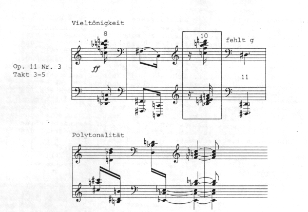 Den vierten bis fünften Takt analysiert Berg als eine zehntönige Akkordfläche, die mit einem zusätzlichen Ton nur noch ein g brauchen würde, um alle zwölf Töne umfassen zu können (siehe oben). In den Takten 26-31 des ersten Stückes der Orchesterstücke erscheinen alle zwölf Töne. Berg führt dieses Phänomen auf ein mehrstimmiges totalchromatisches Idiom zurück, in dem verschiedene harmonische Bildungen, Terzenakkorde oder Ganztonschritte udgl. vorkommen. Es ist schließlich möglich, aus einem zwölftönigen Klangzentrum alles abzuleiten. Damit zeigen Bergs Analysen, daß Schönberg das Verhältnis zwischen Tönen bereits neu zu verarbeiten begann und in den Werken, die bereits vor dem Wechsel zur Kompositionstechnik mit zwölf aufeinander bezogenen Tönen entstanden sind, eine neue grundlegende Basis außerhalb harmonischer Relationen geschaffen hat, aus der die musikalische Form eines ganzen Stückes entstehen könnte.