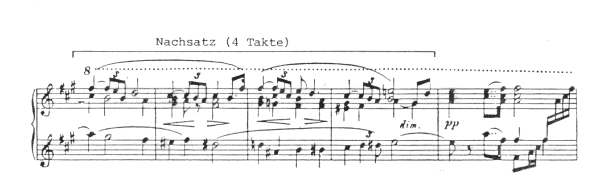 ![]() Ist in diesem Beispiel durch Fortspinnung noch ein Zusammenhang zwischen erster und zweiter 4-Takt-Gruppe gegeben, den man als "organisch" empfinden kann, so fallen im nächsten Beispiel die beiden Hälften der symmetrischen 8-Takt-Gruppe regelrecht auseinander: Die 4 Takte des Elsa-Motivs werden im Nachsatz nicht durch Wiederholung oder Entwicklung, sondern durch Rückgriff auf die vorausgegangene, zwar ähnliche, aber eben doch anders geartete 4-Takt-Gruppe zur 8-Takt-Gruppe ergänzt: 22)