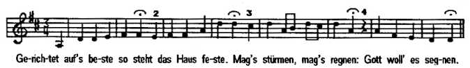 - ![]() Aus einem Brief des Komponisten: "Es kam mir darauf an, den Kanon so simpel und eingängig zu machen, daß auch ermüdete Bauarbeiter und Zimmerleute ohne Notenkenntnis und Übung im Singen mit rauhen Kehlen diesen Kanon schnell auffassen und zur eigenen Freude ohne viel Vorarbeit singen könnten. Daß mir das gelungen ist, hat unser gestriges Richtfest, bei dem ich den Kanon mit zwei Dutzend Maurern und Zimmerleuten sang, gezeigt."