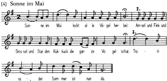 Kreis (Tanzanweisung) A 8 Schritte zur Kreismitte / B 8 Schritte zurück C seitlich rechts hüpft1. Takt seitlich links hüpft2. Takt drehen 4 Schritte rechts herum3. und 4. Takt Kreis zu dreien abzählen. Kanonischer Einsatz singend und tanzend.