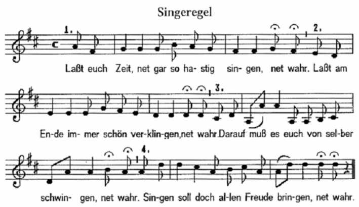 jeweiligen Spielhabitus zu finden. Es gibt Lieder, die etwas anderes als Ein- und Durchsingen nicht zulassen, darin erfüllen sie sich. Besinnliche Lieder kann man höchstens zerspielen. Nicht zuletzt waren catches und rounds (also Kanons) Ausdruck musikalischer Geselligkeit. Beim Kanonsingen liegt daher vornehmlich der Einstieg für musikalisches Spielen und damit für Geselligkeit beim Offenen Singen. Der persönliche Stil, der damit einbegriffen ist, kann sich allerdings nur bei einer begrenzten Teilnehmerzahl durchsetzen (etwa 300). "Umgang" mit einem Kanon ![]() Das wiederkehrende "net wahr" könnte man als eine rhetorische Floskel auffassen, wie sie von manchem Lehrenden bis zum Überdruß gebraucht wird. Rhetorisch bedeutet das "net wahr" besondere Eindringlichkeit, es heischt nach Zustimmung. Aber kann es nicht auch Einverständnis meinen? Benutzen wir es, um es uns gegenseitig ermunternd zuzunicken, und singend wird es so zu einem Zu- und Miteinandersingen. Geselliges äußert sich schon an der Begrüßung. In den überlieferten Figurentanzformen ist die Kette, rechte Hand - linke Hand, eine Art Begrüßung: ein flüchtiges Verweilen von Hand zu Hand, und man schaut einander entgegen. (Abwegig ist dabei der feste Händedruck und ungesellig das verlegene oder uninterssierte Vorbeigucken.) Den vierstimmigen Kanon kann man in zwei konzentrischen sich in der Kette bewegenden Kreisen singen: |