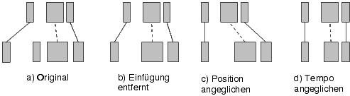 Enthält ein Motiv drei oder mehr zugeordnete Noten, gibt es mehrere mögliche Tempo-Varianten, die alle bestimmt und bewertet werden. Bei zwei Noten gibt es nur eine Möglichkeit, das Tempo und die relative Position zu bestimmen. Bei einer Note ist das Tempo nicht determiniert. Man könnte die Länge der zugeordneten Noten vergleichen, was jedoch aufgrund der geringen wahrnehmungsmäßigen Wirkung von Dauern zu unzuverlässig ist. Daher wird das Tempo als gleich zum vorhergehenden Motiv angenommen. Wenn es mehrere Tempo-Varianten gibt, werden alle erzeugt, bewertet und die bestbewertete ausgewählt (das genaue Verfahren wird in Abschnitt 9.2.3 beschrieben). Dieses Verfahren liefert für mehr als zwei Noten nur eine Annäherung an den tatsächlich optimalen Wert für die Anpassung durch Verschiebung und Streckung, da nur relativ wenige Alternativen berücksichtigt werden. Die Möglichkeit, eine optimale Lösung zu berechnen, hängt von den verwendeten Merkmalen und darauf definierten Maßen der Abweichung ab. Für die in der MaMuTh verwendeten euklidischen Abstandsmaße5 lassen sich die optimalen Werte analytisch direkt bestimmen.Für die hier verwendeten durch ein Neuro-Fuzzy-System oder ein neuronales Netz berechneten Maße ist die Möglichkeit einer analytische Bestimmung abhängig von der Merkmalsberechnung und den im Netz verwendeten Funktionen für Netzeingabe, Aktivierung und Ausgabe der Neuronen. Hier sind numerische Verfahren möglich, die eine näherungsweise optimale Lösung suchen, wobei die Konvergenz auf ein globales Minimum nicht immer garantiert ist. Welches Verfahren geeignet ist, hängt von den jeweils verwendeten Funktionen ab. Da diese Berechnung bei der Auswahl der Interpretationen sehr oft durchgeführt werden muß, ist aus Effizienzgründen bisher kein Optimierungsverfahren realisiert worden. Diese Ungenauigkeit der Berechnung hat sich in den Tests bisher auch nicht als Problem dargestellt. Sobald metrische Strukturen berücksichtigt werden, ist allerdings anzunehmen, daß eine genauere Berechnung nötig ist. Wenn metrische Strukturen berücksichtigt werden, kann man nicht mehr annehmen, daß eine Anpassung, die zwei Noten ohne Abweichung der Einsatzzeiten einander zuordnet, eine gute Näherung an die optimalen Werte darstellt. Die Berücksichtigung des Verhältnisses der Noten zu metrischen Zeiten kann dazu führen, daß eine Anpassung |