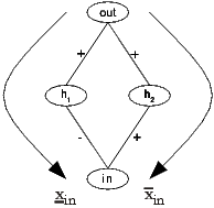 wobei fx die durch das Neuron x berechnete mehrstellige Funktion der gewichteten Eingaben bezeichnet. Der Wert xin taucht hier zweimal als Argument auf, da es zwei Wege durch das Netz von in nach out gibt. Allgemein kann man die Aktivierung eines Ausgabeneurons als eine mehrstellige Funktion fout darstellen, in der jeder Weg von einem Eingabeneuron zum Ausgabeneuron einem Argument entspricht: