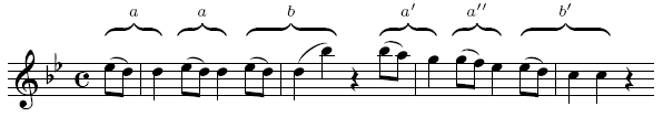 Die Beziehungen von Motiven wurden in der Musiktheorie kaum systematisch untersucht. Eine Theorie speziell der zeitlichen Motivbeziehungen stellt Eugene Narmours Modell der Implikation und Realisation dar.59 Dieses Modell ist allerdings nicht formal definiert, sondern wie die meisten Musiktheorien vor allem anhand von Beispielen dargestellt.Die übliche Form der Notation motivischer Strukturen verwendet Buchstaben für die Bezeichnung der Motive, wobei gleiche Buchstaben für gleiche Motive (bis auf zeitliche Position) und Buchstaben mit einem ›’‹ für ähnliche Motive stehen, wie in Abbildung 2.2 beispielhaft dargestellt ist. Auf diesem Ansatz beruht die paradigmatische Analyse.60 Sie beschreibt die Zuordnung von Motiven zu einem Paradigma, d.h. einem ersten Vertreter seiner Motivklasse. Wenn ein Motiv zum ersten mal erscheint, wird es einem bereits bestehenden Paradigma zugeordnet, oder es definiert selbst ein neues Paradigma.2.4. Musiktheoretische SystemeVon den wichtigsten Vertretern der traditionellen Musiktheorie haben Moritz Hauptmann und Hugo Riemann der Metrik und Rhythmik eigene Werke gewidmet. Heinrich Schenker beschäftigte sich dagegen weniger intensiv mit rhythmischen Fragen, denn sie sind in seinen Analysen von geringerer Bedeutung. Während Hauptmanns Ansatz sich in der Praxis nicht durchgesetzt hat, sind die Theorien Riemanns und Schenkers noch in Gebrauch. Einige neuere Ansätze der Musiktheorie, die als kognitive Modelle konzipiert sind, werden in Kapitel 4 behandelt.