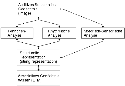 Aus den vorhandenen Ergebnissen hat sich bezüglich der Signalverarbeitung in der auditiven Wahrnehmung ein Stufenmodell herausgebildet. Zunächst wird Schall in der Cochlea im Innenohr in Nervenimpulse umgesetzt, die über die Hörbahn bis in den auditiven Cortex weitergeleitet werden. Hier gibt es eine erste kurze Speicherung der Signale, deren Tiefe im Bereich weniger hundert Millisekunden liegt. Cowan spricht von einem short auditory store, in dem das Signal vermutlich noch in weitgehend unverarbeiteter Form vorliegt.11 Auf diesem Zwischenspeicher, der auch Puffer oder Spur genannt wird, operieren die Tonhöhen-Analyse und die rhythmische Analyse, die die Erkennung von Ereignisanfängen (onset detection), Gruppierungen, Metrum durchführt. Es scheint sich hier um getrennte Mechanismen zu handeln, obwohl sie bei Melodien zu einer einheitlichen Wahrnehmung führen. Nach Todd ist dabei auch die sensorisch-motorische Steuerung beteiligt.12 Aus den Ergebnissen dieser Analysen wird eine Repräsentation der gehörten Ereignisse gebildet. Diese Repräsentation wird länger gespeichert, mit einer Dauer von mehreren Sekunden entsprechend dem bei Cowan erwähnten long auditory store. Die Bildung dieser Repräsentation interagiert mit dem assoziativen Gedächtnis, d.h. mit bereits gespeicherten Repräsentationen und Wissen über Musik oder Sprache, indem Muster wiedererkannt oder neu gebildet werden. Dieser Zusammenhang wird in Abbildung 3.1 schematisch dargestellt. Im folgenden werden Erkenntnisse über die Funktionen und Eigenschaften der einzelnen Bereiche behandelt.