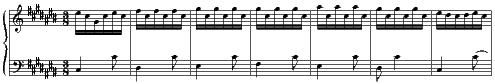 3.3.6. StreamingStreaming bezeichnet die Aufteilung von Ereignisfolgen in mehrere zeitlich parallele Ströme. Es wird durch große Unterschiede der Tonhöhe, Klangfarbe oder räumlichen Positionierung bei kleinen zeitlichen Abständen akustischer Ereignisse ausgelöst. Die bisher beschriebene Gruppierung von Sequenzen bezeichnet Bregman dagegen als sequential grouping. Die Zusammenfassung von Ereignissen durch Streaming kann als im wesentlichen auf primitiven Mechanismen basierend angesehen werden und kann auch durch rhythmische Gruppierung beeinflußt werden.68 Streaming wird bei virtueller Zweistimmigkeit wirksam, wie sie etwa J.S. Bach in seinen Werken häufig verwendet hat.69 Bei der virtuellen Zweistimmigkeit liegen die tonlichen und zeitlichen Abstände meistens so, daß eine unbedingte Trennung der Ströme nicht gegeben ist, sondern sowohl die Hörweise als eine Melodielinie als auch die Auffassung als zwei Melodielinien möglich sind.70