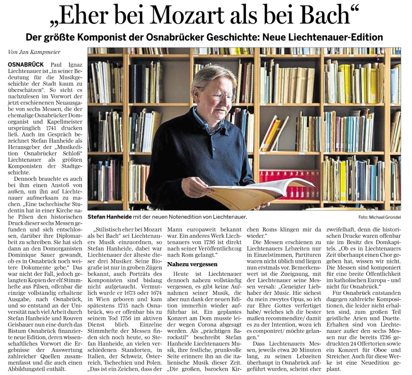 | Hanheide, Stefan (Hrsg.) unter Mitwirkung von Rouven GeisbauerPaul Ignaz Liechtenauer: Sechs Messen op. 2für 4 Soli, Chor zu 4 Stimmen, Orchester und Basso continuo, 1741 epOs-Music, 272 Seiten, zahlreiche Abbildungen, Faksimiles, Kommentare zur Edition. Druckausgabe im Großformat Bd. 4 in der Reihe MUSIKEDITION OSNABRÜCKER SCHLOSS,