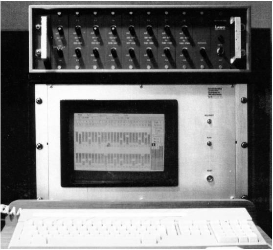 Abbildung 21 zeigt unser erstes analoges Verzögerungsgerät, das z. B. auch Klaviertöne ohne Jaulen bis zu 14 Sekunden zeitlich versetzt wiedergeben konnte. Darunter sehen Sie ein im Auftrag und in Zusammenarbeit mit dem Freiburger Studio industriell entwickeltes digitales Verzögerungsgerät, das natürlich feiner unterteilbare und größere Zeitversetzungen zuließ. Gerade bei diesem volldigitalen Gerät wurde auf meinen Wunsch eine besondere Sicherheitsvorkehrung konstruiert. Sollte im Konzert eine digitale Stufe ausfallen, was in jener Zeit nicht unüblich war, so wurden die restlichen noch intakten digitalen Stufen geräuschlos so zusammengeschaltet, daß zwar eine Verkürzung der Zeitversetzung von wenigen Millisekunden auftrat, diese aber in den meisten Fällen für Interpreten und Zuhörer musikalisch nicht wahrnehmbar war.