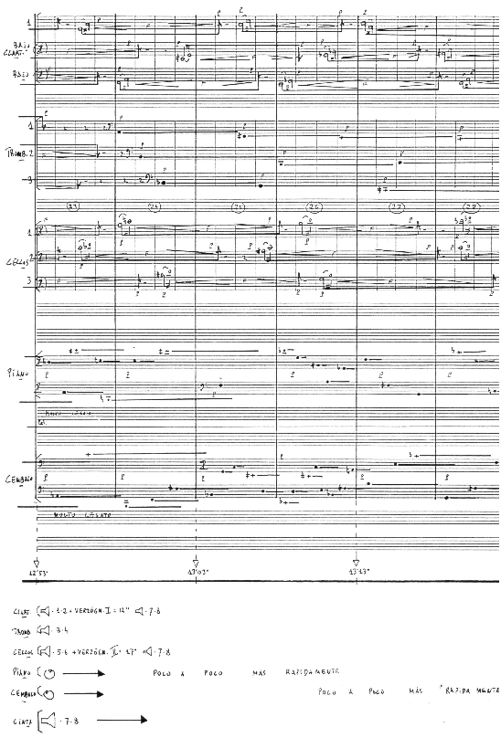 In unserem Beispiel sind zwei Verzögerungen, Klangbewegung und Live-Klangverstärkung eingesetzt, wobei Halffter großen Wert auf die genaue Klangortsverteilung, also auf die Lautsprecherzuordnung legt. Die Lautsprecherpositionen sind zuvor in einer speziellen technischen Legende ebenfalls präzisiert. Dazu ein Zitat des Komponisten: „Wichtig erscheint mir auch der Hinweis, daß die Arbeit mit der Live-Elektronik und die Konzeption der Instrumentalpartie nicht unabhängig voneinander erfolgten und daß jeder Fortschritt auf dem einen Gebiet auch sofort das andere beeinflußte, denn es stand für mich von vornherein fest: das Werk sollte das Resultat aus dem Zusammenwirken unterschiedlicher musikalischer Gegebenheiten sein. Damit erwies sich die Integration der Elektronik schon im konzeptionellen Bereich als conditio sine qua non. Alles andere wäre in meinen Augen eine Verkleidung musikalischer Strukturen, d. h. eine Maskierung von |