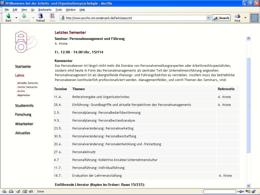 Das Gestaltungs- und Pflegekonzept der Website sah es bisher vor, dass die zugehörigen Seiten auf einem lokalen Rechner mit Adobe GoLive erstellt und dann als statische HTML-Seiten per FTP auf den Webserver übertragen wurden. Dezentrales Arbeiten, d.h. die Pflege der Seiten durch die akademischen MitarbeiterInnen des Fachgebiets, war hier aus technischen und organisatorischen Gründen nicht möglich. Das Pflegemodell sah daher einen verantwortlichen Webmaster aus dem Fachgebiet vor, der den Webauftritt koordiniert. Die Daten wurden von den Lehrenden erstellt, die den Webmaster mit überwiegend digitalem Material versorgten. Dieser setzte die Inhalte anschließend in eine publikationsfähige Form um. Das Vorgehen hierbei war weitgehend unstandardisiert. Durch den insgesamt hohen Pflegeaufwand kam es insbesondere zu Semesterbeginn bei den häufig zu aktualisierenden Seiten (Prüfungsfragen oder auch das in der Lehre angebotene Semesterprogramm) immer wieder zu Verzögerungen und zu einem nicht aktuellen Informationsstand. |
