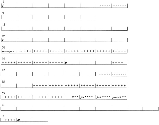 Dynamik für den Anfang und für das Ende der progressiven Veränderungen festzulegen. Das crescendo in T. 31–42 stellt ein besonders gutes Beispiel dieser Problematik dar. Da das forte von T. 23 nicht ergänzt wird, soll es wohl in T. 31 noch gültig sein, und das crescendo über zwölf Takte hinweg von forte bis fortissimo steigen. Eine so kleine, gleichmäßige Steigerung der Lautstärke von dieser Dauer kann jedoch akustisch kaum bemerkt werden. Um dieses Problem zu umgehen, müsste entweder in T. 31 die Lautstärke reduziert oder die Artikulation in den besagten zwölf Takten so manipuliert werden, dass beim Hörer der Eindruck eines crescendos erweckt wird – dies ist jedoch eine sehr schwierige Aufgabe. Ein ähnliches Problem findet sich in den T. 8 und 9. Hier besteht die Frage nicht nur, welche Dynamik das decrescendo erreichen soll, sondern auch, ob diese neue Dynamik in den darauffolgenden Takten Gültigkeit behalten sollte. Mit T. 8 endet aber der erste Satz, und mit T. 9 beginnt der zweite, und zwar identisch mit T. 1 (Abbildung 8.4). Es ist wahrscheinlich, dass Chopin für T. 9 an dieselbe Dynamik wie in T. 1 gedacht hat, auch wenn er sie nicht notiert hat. Solche und ähnliche Fälle bedürfen einer individuellen Diskussion, die erst bei der Gestaltung der Interpretation stattfinden wird.