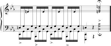 pausenfreien Läufen in Sechzehntelnoten. Nur zwei Ausnahmen brechen diese Regel.