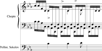 Etüde Nr. 12, T. 78–79. Alternative Betonung der Noten des