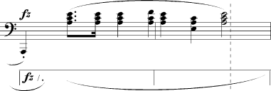Aus der grafischen Darstellung (Abbildung 4.1) kann man klar herauslesen, dass im Hinblick auf die Artikulation und die lokale Dynamikveränderung der Unterschied zwischen linker und rechter Hand das bedeutendste Merkmal der Etüde Nr. 11 ist. Zum einen hat die rechte Hand bis auf die zwei Akzente in T. 87 durchgehend Bindebögen, die nie kürzer aber meistens bedeutend länger als die der linken Hand sind. Dieses deutet auf eine sehr in die Länge gezogene, horizontale Phrasierung hin, die im Kontrast mit den deutlich kürzeren, senkrechten Kommentaren der Unterstimme steht. Deren fast martialischer Aspekt wird noch dadurch betont, dass bis auf wenige Ausnahmen die Akzente, forzati und staccati in der linken Hand vorkommen. Ein weiterer, sehr bedeutender Unterschied zwischen beiden Stimmen besteht darin, dass die Oberstimme durch ihre voll- bzw. mehrtaktige Bindebögen das Metrum verstärkt, die Artikulationen der Unterstimme aber genau das Gegenteil bewirkt. Diese metrische Instabilität findet ihren Ursprung in den T. 3–5, besonders auf der letzten Viertelnote von T. 4, wo ein mit einem Orgelpunkt versehener Dominantseptakkord sichtlich auf eine Auflösung wartet, die mit T. 5 auch tatsächlich eintritt (Abbildung 4.6). Diese Auflösung wird von Chopin durch einen Bindebogen mit den zwei vorherigen Takten verbunden, vom darauffolgenden Satz jedoch getrennt, was zur Destabilisierung des metrischen Gefühls führt. Da der Puls nicht dem einer Viertel- sondern einer halben Note entspricht, durchschneiden die Hemiolen der Unterstimme in den T. 9–11, 17–21, 27–28, 35–37 und 73–75 oftmals den metrischen Puls. Der dadurch entstehende auftaktige Charakter wird noch deutlicher betont, indem jeweils auf der zweiten Hälfte eines Pulses ein Akzent notiert ist (vgl. T. 9–10, 17–18, 27–28, 35–36 usw.). Die zahlreichen staccati, die sich auf der ersten Viertelnote der jeweiligen Takte finden, haben ebenfalls eine destabilisierende Funktion. Schließlich soll hier eine Liste von spezifischen Eigenschaften aufgestellt werden, die bei der Interpretation eine Rolle spielen könnten: