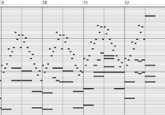 T. 59–60 und 85–86 bleibt der statische Charakter einer Hand beibehalten, aber der gleichmäßige Abstieg wird durch einen Aufstieg ersetzt. Als letzter bemerkenswerter Abschnitt können die T. 61–68 genannt werden, wo beide Hände sich in entgegensätzlicher Richtung bewegen. Zweimal hintereinander beginnen sie in extremen Registern und treffen im mittleren Bereich zusammen. Nach den T. 65–66, wo sie ziemlich eng aneinander bleiben, bewegen sich beide Hände wieder auseinander. 4.1.5. TexturEs wurde eine nach Abschnitten gegliederte sowie nach linker und rechter Hand getrennte Beschreibung der Textur des Werkes erstellt, die in Tabelle 4.1 zu finden ist. Als erstes fällt der deutliche Kontrast zwischen rechter und linker Hand auf. Mit Ausnahme von den Stellen, an denen beide Hände zu einer homogenen Textur beitragen, und von den T. 41–44, in denen die Rollen beider Hände im Vergleich zum vorigen und darauffolgenden Abschnitt invertiert sind, ist die rechte Hand fast durchgehend einstimmig. Dagegen weist die linke Hand verschiedenste Texturen auf. Es gibt in der Etüde Nr. 11 drei Stellen, an welchen die Textur einheitlich ist: T. 1–4, 87–88 und 93–96. Bemerkenswert ist die Tatsache, dass unter ihnen der Anfang und das Ende des Stückes zu finden sind. Diese beiden viertaktigen Abschnitte bilden eine texturbezogene Symmetrie. Die linke Hand weist aber eine zusätzliche Symmetrie auf, nämlich die Unterteilung der ›mittleren‹ T. 5–92 in zwei gleichlange Blöcke: