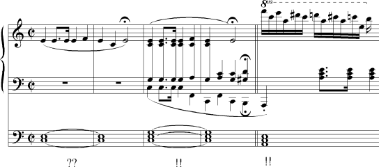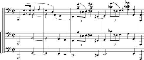 Die Monodie der zwei ersten Takte, welche als melodischer Hauptgedanke – und wohl auch im schönbergschen Sinne als Grundelement der ›developing variation‹5