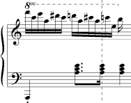 Da aber nicht nur die Noten, sondern auch die Bindebögen in beiden Händen, die Pedalanweisungen und die staccati der linken Hand in der parametrischen Analyse auffallende metrische Muster aufweisen konnten, wurden sie ebenfalls als Material für die metrische Analyse benutzt – ein in der Performanceforschung mit Rubato erstmaliger Versuch. Eigens zu diesem Zweck wurden MIDI-Dateien erstellt, in welchen die jeweiligen Bindebögen, Pedalanweisungen und staccati durch Noten beliebiger Höhe oder Dauer, aber mit gleicher Einsatzzeit ersetzt wurden. Für die Pedalanweisungen und die staccati der linken Hand wurden jeweils eine, für die Bindebögen aber drei Dateien erstellt: eine für die linke Hand, eine für die rechte, und eine dritte für beide zusammen, da durch ihre Verknüpfung ein durchaus interessanter metrischer Kontrapunkt gebildet wird. Die Analyse in der MetroRubette erfolgte wie gewohnt. Schließlich muss noch erwähnt werden, dass in allen Fällen – bei den Noten wie auch bei den anderen Parametern – nur die Einsatzzeit analysiert wurde; jegliche Information über Dauer oder Aussatzzeit1