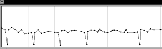Noten der linken Hand (ohne Rollentausch)Die Gewichte, die durch eine metrische Analyse der Noten der linken Hand entstanden sind, besitzen drei auffallende Eigenschaften. Die erste ist eine deutliche und systematische Hervorhebung jeder Sechzehntelnote des rhythmischen Hauptmotivs durch eine charakteristische kleine Gewichtung (Abbildung 7.9). Es wäre durchaus vielversprechend, diese Eigenschaft bei der Performance akustisch umzusetzen, um z. B. die Artikulation der linken Hand zu verändern. Leider lassen aber die beiden anderen Eigenschaften einen solchen Einsatz nicht zu.
