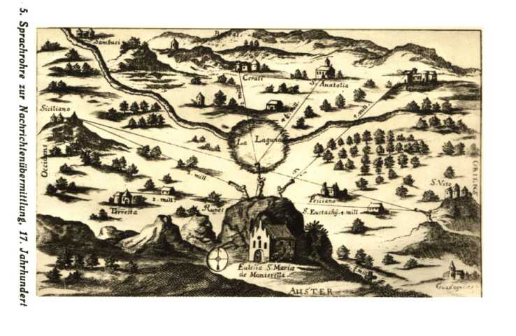 Nr. 5: Sprachrohre zur Nachrichtenübermittlung. Die Versuche wurden von Athanasius Kircher im 17. Jahrhundert bei Rom durchgeführt. Abbildung aus: Athanasius Kircher, Neue Hall- und Thonkunst, 1684, (Aufnahme: Preußische Staats-Bibliothek.) << ZURÜCK zum Abbildungsverzeichnis ![]() |