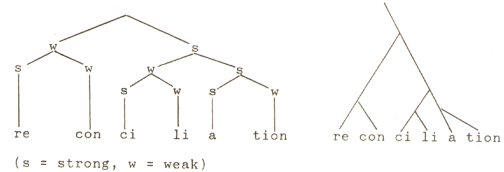 Eine weitere Analogie zwischen musikalischer und linguistischer Theorie existiert zwischen der formalen Beschreibung der time-span structure und derjenigen sprachwissenschaftlichen Analyse, bei der es um die Betonungsverteilung innerhalb einer bestimmten Sprache geht (prosodic structure). Ein detaillierter Vergleich würde hier zu sehr ausufern (für Einzelheiten s. Lerdahl/Jackendoff 1983, S. 314-330) und soll daher auf die eigentlichen Ergebnisse beschränkt werden. In beiden Fällen wird das musikalische bzw. phonologische Ereignis in eine mehrere Ebenen um-fassende Hierarchie segmentiert (s. Abb. 37), und in beiden Fällen werden erst mögliche Baumstrukturen abgeleitet, bevor dann anhand bestimmter (preference-)Regeln aus ihnen die wahrscheinlichste ausgewählt wird. Auffällig ist ebenfalls, daß die prosodischen und musikalischen Baumdarstellungen einander sehr ähnlich sind und ineinander überführt werden können, obwohl beide Theorien völlig unabhängig voneinander entstanden sind: