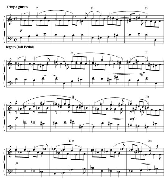 Die Notenfolge H-EIS-E kommt 14 Mal (in verschiedenen Schreibweisen) im Klavierstück vor, das dem Trällerliedchen aus Robert Schumanns Jugendalbum nachempfunden ist. Der besondere Witz ist, daß das Stück in 26 Takten durch alle 12 Dur-Tonarten moduliert (siehe Beethoven op. 39). |