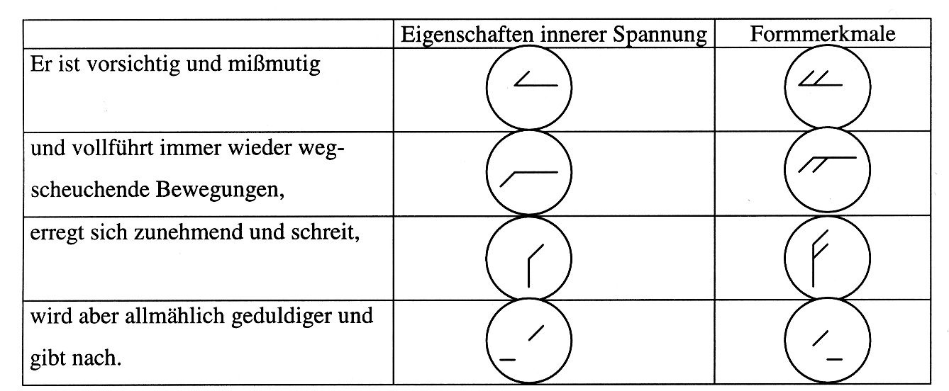 Legende: Anstelle der Eukinetik-Symbole können auch die Anfangsbuchstaben für Raum, Kraft, Zeit und Fluß verwendet werden. Klein geschrieben verweisen sie auf die libidinöse und auskostende Seite der Bewegungsfaktoren, groß geschrieben auf ihre kämpferische Natur. Die entsprechenden Formen werden mit einem Apostroph gekennzeichnet, z. B. R’ k’ z’ F’.