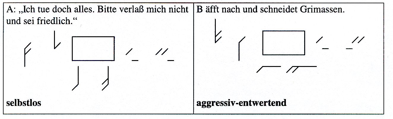 7. Stellen Sie die Befindlichkeit der beiden Partner in ihrer Kommunikation miteinander dar. Legende: Hier wird ein Modell der differentiellen zwischenmenschlichen Interaktion nach Schulz v. Thun (1981 und 1989) in den tanzpsychologischen Ansatz übertragen.