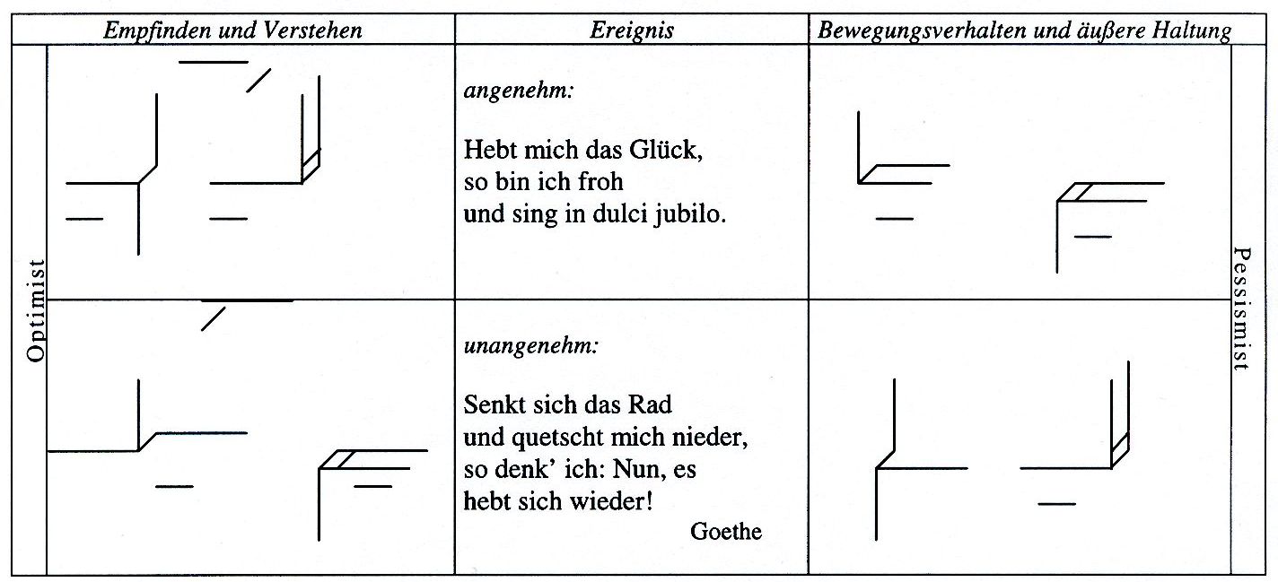 8. Sind die folgenden rhythmisch energetischen Strukturprofile einer optimistischen und pessimistischen Kausalattribuierung zu angenehmen und unangenehmen Ereignissen in bezug auf innere und äußere Haltung richtig? Lösung: ja. Legende: Die tanzpsychologische Analyse des Gedichts von Goethe wird hier mit dem kognitionstheoretischen Ansatz nach Seligman (1993) verbunden. |