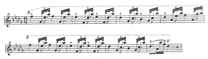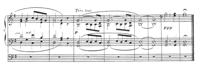 B Das kompositorische Rezept Lefébures basiert in Melodiebildung und Form auf dem Prinzip der ständigen leicht variierten Wiederholung. Die mit einem Glöckchen-Arpeggio verzierte Kantilene des Refrains ist aus einem kurzen, einprägsamen Motiv gebildet: ![]() Formal gewährt das Rondeau den Wiedererkennungseffekt: