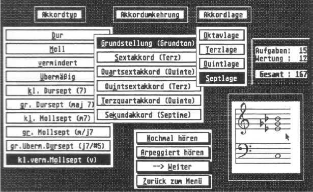 In der dritten Übung des Hauptteils Akkordketten besteht die Aufgabe darin, Dreiklänge in unterschiedlichen Umkehrungen zu erkennen und zu bestimmen. Zu jedem erklingenden Akkord wird als Hilfestellung ein Akkordton im Notenbild dargestellt. Dieser Ton erklingt zunächst einzeln, danach der gesuchte Dreiklang. Es gilt nun, den Grundton durch Anklicken der entsprechenden ,Klaviertaste‘ auf dem Bildschirm, das Tongeschlecht des durch Betätigen der Knöpfe ,Dur‘ bzw. ,Moll‘ zu bestimmen. Ein Beispiel: Man sieht den Ton ,As‘, gesucht wird der Des-Dur-Dreiklang. Die Antwort ist richtig, wenn die Taste ,Cis/Des‘ und das Tongeschlecht ,Dur‘ angeklickt werden. Die Akkorde der dritten Übung werden immer in Akkordketten von acht aufeinanderfolgenden Akkorden dargeboten. Danach beginnt der Übungszyklus von vorne. Akkordtypen und Akkordfolgen werden zufällig ausgesucht, stehen allerdings immer in einem musikalisch sinnvollen Zusammenhang (z. B. Terzverwandtschaft). In der vierten Übung des Hauptteils werden typische Pop-/Rock-/Jazzakkorde zu Gehör gebracht. Dazu erscheinen auf dem Bildschirm jeweils acht Akkorde im Notenbild sowie die dazugehörigen Akkordsymbole, die aus einem Bestand von insgesamt 26 Akkordtypen ausgesucht werden. Von den acht Akkorden wird jeweils einer per Zufall ausgewählt und vorgespielt. Der Hörer soll mit der Maus den betreffenden Akkord anklicken. Auch hier wird der Schwierigkeitsgrad allmählich gesteigert, indem komplizierte Akkordtypen in die Auswahl gelangen. Der Hörer kann zur klanglichen und optischen Abwechslung oder zum Üben der Akkorde in anderen Tonarten vorweg verschiedene Grundtöne einstellen. Auf die Bewertung hat dies keinen Einfluß. Alle Übungsaufgaben im Hauptteil des Programms Akkorde werden, wenn das Hörurteil nicht korrekt ausfällt, auch mehrmals vorgespielt. Natürlich wird dann die höchstmögliche Punktzahl pro Aufgabe nicht mehr erreicht und die Steigerung des Schwierigkeitsgrades geht entsprechend langsamer vonstatten. |