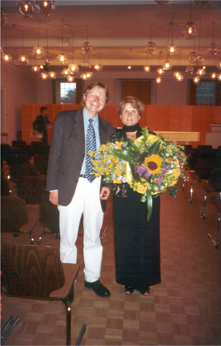 Sabine Giesbrecht bei ihrer Verabschiedungsfeier am 21. Juni 2002 im Musiksaal der Universität (links Stefan Hanheide)