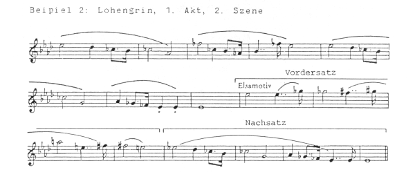 ![]() Ist in diesem Beispiel durch Fortspinnung noch ein Zusammenhang zwischen erster und zweiter 4-Takt-Gruppe gegeben, den man als "organisch" empfinden kann, so fallen im nächsten Beispiel die beiden Hälften der symmetrischen 8-Takt-Gruppe regelrecht auseinander: Die 4 Takte des Elsa-Motivs werden im Nachsatz nicht durch Wiederholung oder Entwicklung, sondern durch Rückgriff auf die vorausgegangene, zwar ähnliche, aber eben doch anders geartete 4-Takt-Gruppe zur 8-Takt-Gruppe ergänzt: 22)
