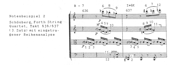 Notenbeispiel 2 Schönberg, Forth String Quartet, Takt 636/637 (3. Satz) mit eingetragener Reihenanalyse